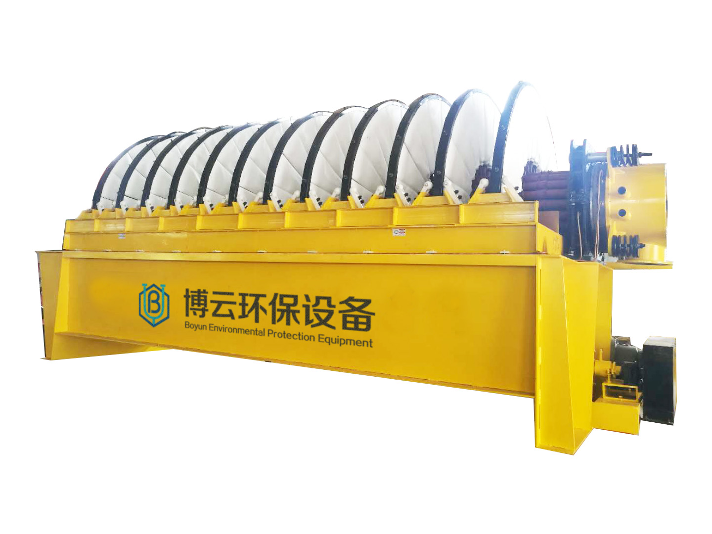 PG系列盤式真空過濾機(jī) (1)扇形濾板脫水孔分布均勻,孔率合理,筋條尺寸大,由高強度工程塑料制成,壽命提高了2-3倍。 (2)濾液管過濾數(shù)面大,分配頭腹腔容積大,提高了抽氣率和濾液排放效果。 (3)耐磨錦綸、單或復(fù)絲濾布使脫餅率高且不易堵塞,使用壽命長。 (4)多點干油泵集中多點自動潤滑。 (5)濾布自動清洗裝置,保持了其良好的脫水效果。 (6)臥式強制高速攪拌、軸端采用橡膠及石墨盤根和水壓差三重密封不漏漿。 (7)主傳動無級變速,依物料的濃度及流量調(diào)節(jié)(交流調(diào)速電機(jī)或變頻器),以求達(dá)到理想的工作效果 。 (8)每盤由20片扇形板組成,加強了過濾過程控制,成餅厚度均勻。 (9)磨擦片采用特制耐磨硼鑄鐵,剛?cè)嵯酀?jì)密封佳,使用壽命達(dá)到十年以上。 (10)濾液管為高強度耐磨陶瓷復(fù)合鋼管,提高壽命10倍以上。 (11)濾液管與濾扇接口去掉下法蘭,采取模具定位直接焊接,減少了90%可能的漏氣點。