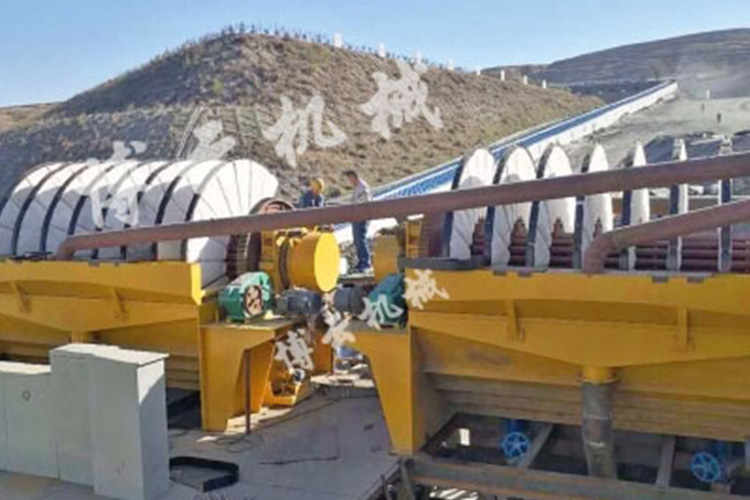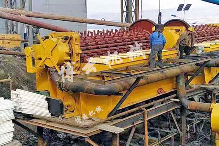 盤式真空過濾機由各個單獨的扇形片的圓盤構成。每一個扇形片為單獨的過濾單元,由濾布做成布套在扇形片上形成濾室。過濾盤由電機通過減速器及開式齒輪傳動來驅動,過濾盤順時針方向轉動,濾室里的礦漿在吸附區借助于真空泵在過濾介質兩側形成的壓力差,附著在過濾盤上形成濾餅后,攪拌器旋轉防止固體沉淀,濾餅離開液面后,在真空作用下繼續脫去水分。濾液透過濾布,經過濾液管,從分配頭排出。濾餅在卸料區由反吹風卸料落入排料槽,整個作業過程連續循環進行。